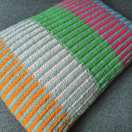 Puten strikkes rundt som en sylinder i 2-farget ribb, hvor garnet holdes som ved flerfargestrikk. En nybegynnervennlig pute eller “fjersynsstrikk” til den erfarne 🙂