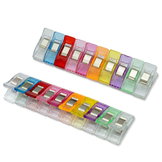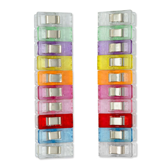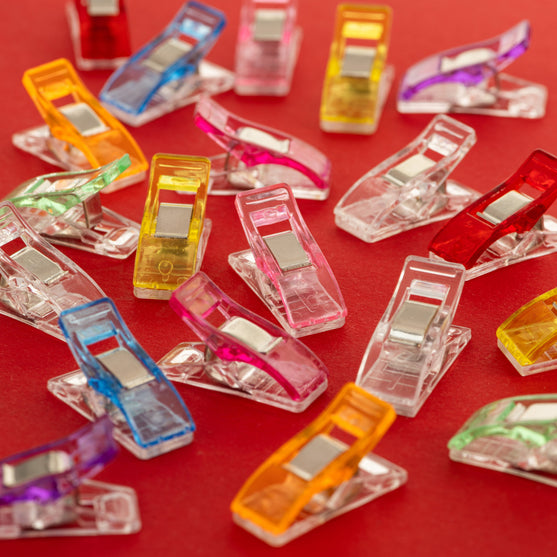Pakken inneholder 20 klips i 9 flotte farger. Størrelsen og fargen gjør dem lette å finne hvis du mister dem, også stikker de ikke, som knappenåler kan gjøre. Det er en kjempefordel å bruke disse klipsene hvis du arbeider med materialer som enten er vanskelige å stikke knappenåler gjennom eller som du ikke ønsker å stikke hull i. Det kan f.eks. være skinn eller andre kraftige materialer.